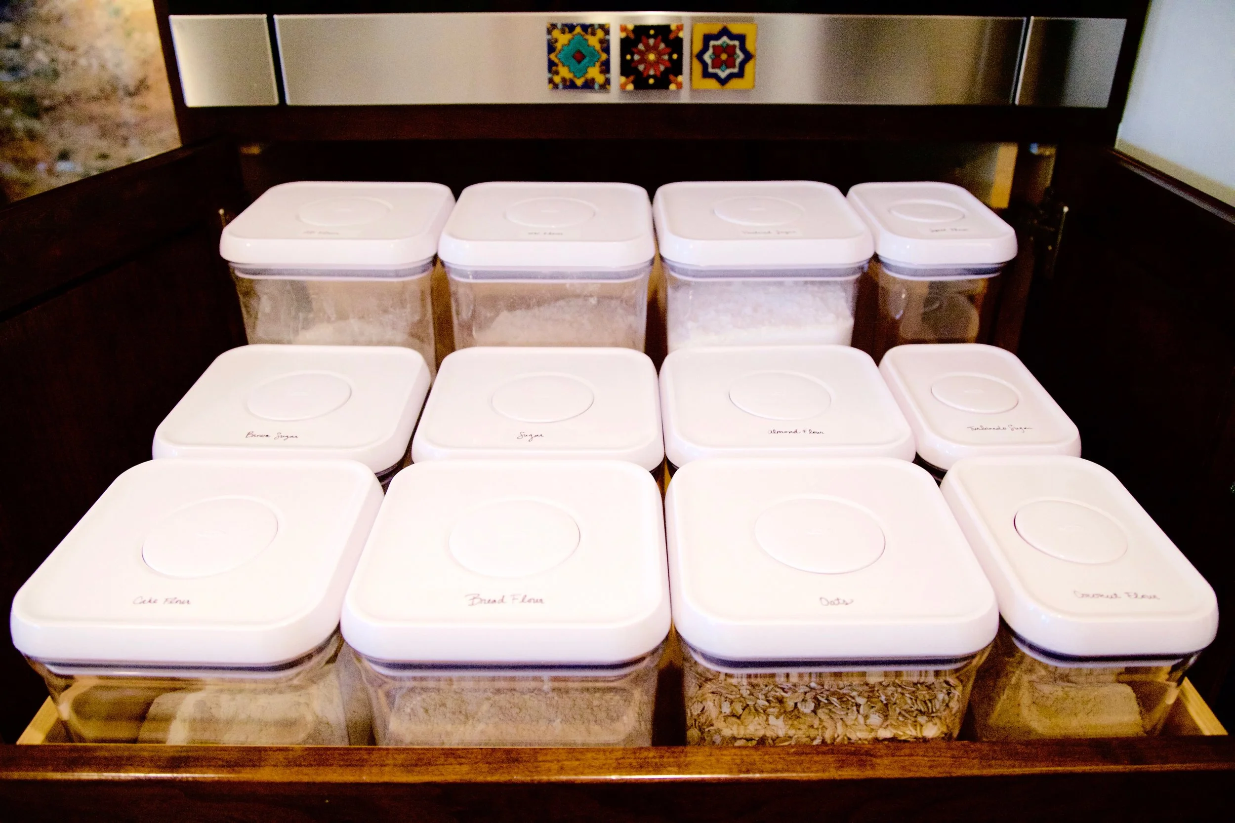 Tash is a chef and cooks a ton, so we started by designating the top drawer as a space for bulk ingredients. It's important to choose product that fits your space well, and a mix of square and rectangle OXO containers worked perfectly here. We filled them with her staple ingredients and I chose clear address labels with simple handwriting.