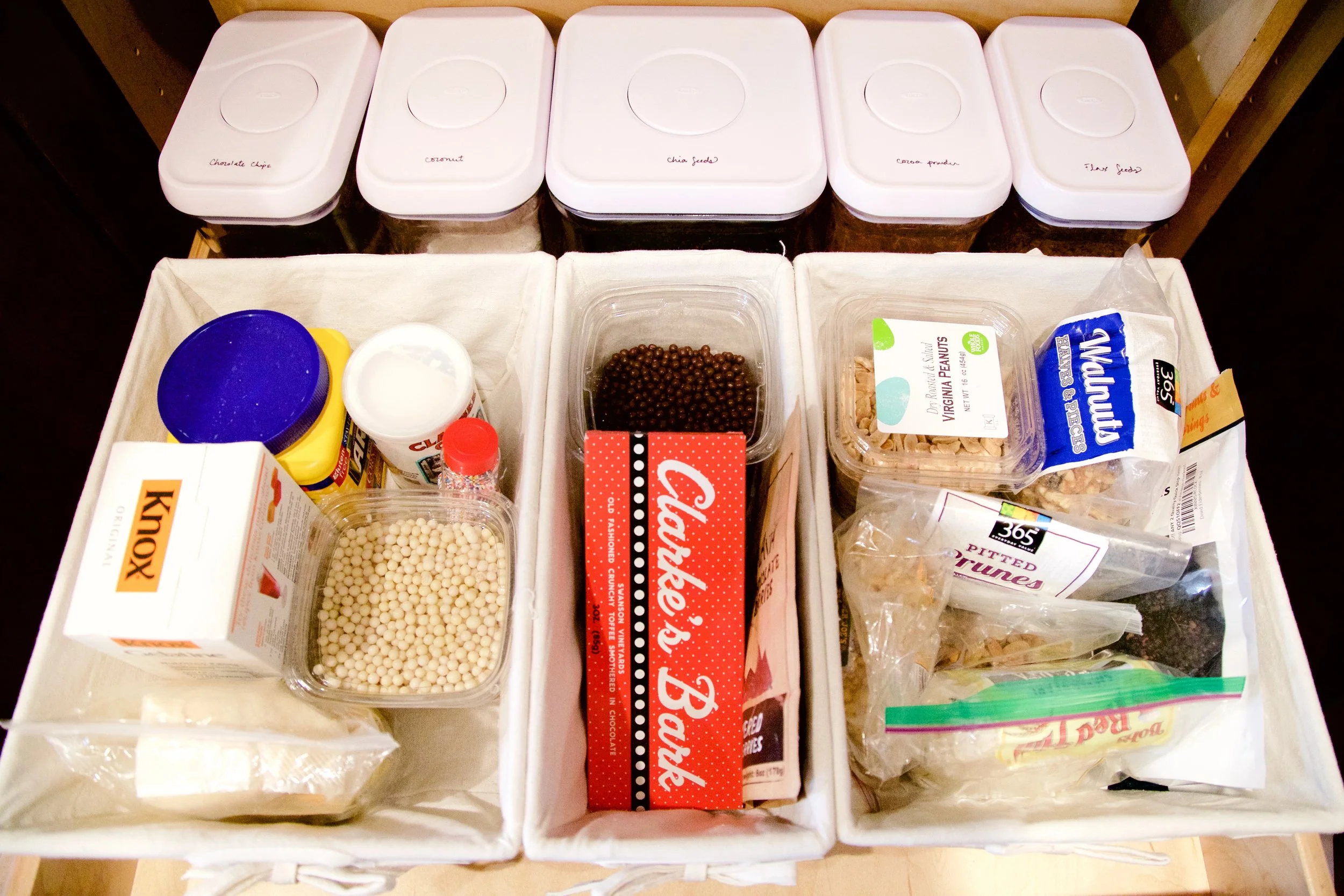 For the third drawer, we chose to group all of the grains, pastas and legumes/beans together. Like in the baking drawer, we used a combination of large OXO containers to hold bulk grains (white rice, brown rice, pasta, and quinoa), and we categorized the baskets into "pasta," "beans," and "grains."